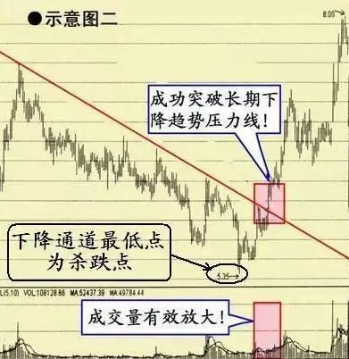 个股经过长时间的大幅下跌,在成交量放大的配合下成功突破长期下降趋势线的束缚,很快出现了大幅上涨的走势,给投资者提供了一次良好的买入机会(请参见下图二)