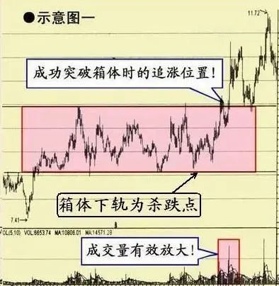 一段时间里股价在箱体里反复振荡运行,在成交量放大的配合下,股价终于突破箱体顶部、开始向上盘升,形成了比较好的买入位置(参见下图一)。